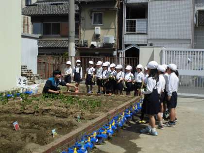 苗を斜めに土にさし、それから土をかぶせるように植え、水をたっぷり上げるようにしましょう、という説明を聞いてから実施しました。
