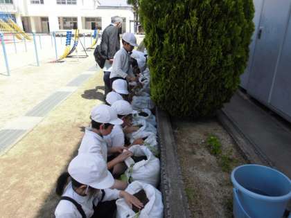 昨日の続報です。今日は、一人一袋のサツマイモの袋に苗を植えました、しおれているようにも枯れているようにも見える苗ですが、強いです。しっかり根付きます。
