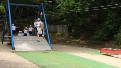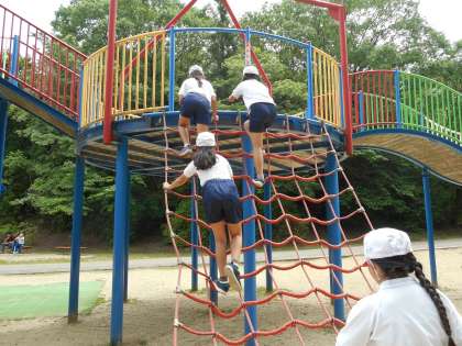 前回雨で流れた5・6年の春の遠足。リベンジには天気が良すぎで、今度は熱中症を心配するほどの蒸し暑さでした。滝谷不動駅から、30分近く歩いて公園の「やんちゃの里」に到達したら、なんと貸切状態。アスレチックや遊具で思い存分遊ぶことができました。高学年が大はしゃぎで遊具で遊ぶ様子は微笑ましかったです(笑) 久野・河野でこの子達をつれて、1・2年生の時の遠足で「天王寺動物園」に行ったことを思い出し、「大きくなったねえ」と感慨深いものがありました。
