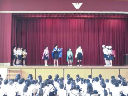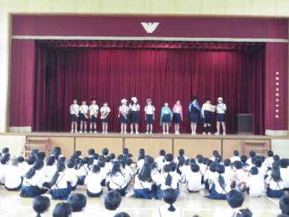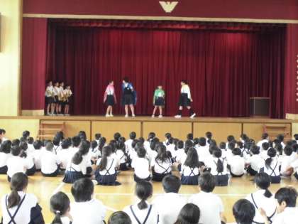 児童会代表委員が中心になって、「あいさつの大切さ」を低学年にもわかるように、寸劇にして教えてくれました。毎年恒例「あいさつの味方・あいさつレンジャー」がテーマソングと共に登場です。あいさつビームを受けて、「あいさつなんてしないよ〜」と言っていた子どもも、「あいさつって気持ちがいいね。大事だね」と心を入れ替えることができました(^O^)