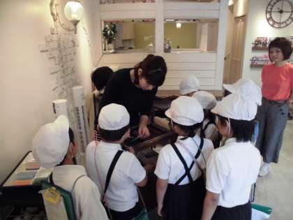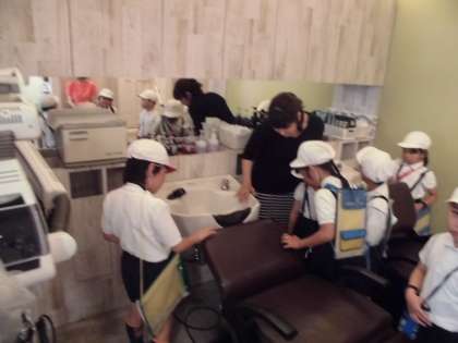 さて、まずは美容院「HASS」です。ここ数年毎年見学させていただいています。美容師さんが使うハサミやシャンプー台など、興味深々で見学していました。