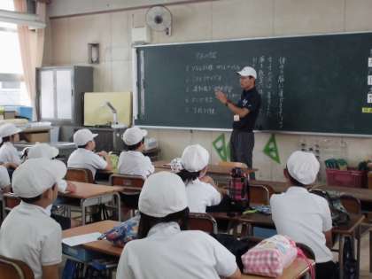 まずは、大きな地震が起きた場合の身の守り方と避難の方法、また地震から2時間後には駒川を逆流してくると予想される津波により、町が浸水してしまうことによる避難について学習しました。