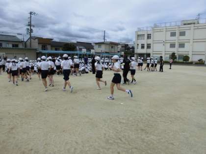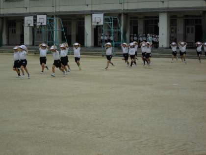 校舎倒壊の恐れも出てくるかもしれません。揺れが治まったら、一旦運動場に避難します。帽子や教科書など身の周りの物で頭を守りながら、足元にも注意して「おさない」「はしらない」「しゃべらない」で速やかに避難します。その後人員点呼です。