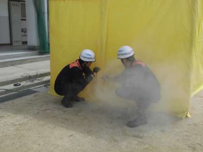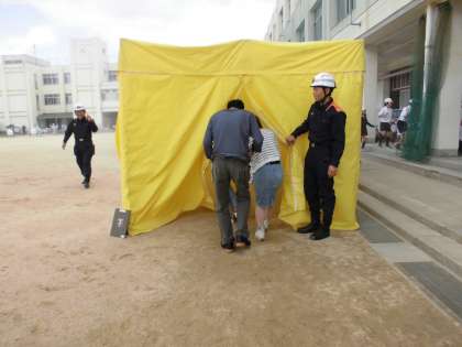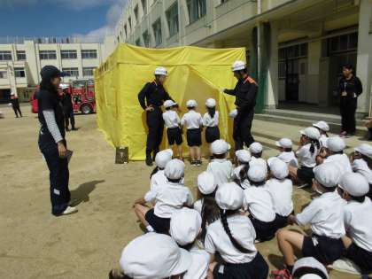 「煙テント」体験の様子です。本物とは違うので、少しいい匂いがするような「煙」なのですが、全く前後左右が見えません。消防の方から、「大人の人は、中で一回転してからスタートしてください」と言われました。伸ばしている自分の手も見えませんでした。これで、煙を吸い込んで一酸化中毒で倒れてしまうのだ、とよく分かりました。保護者の方や校長先生や家野PTA会長も体験され「何も見えない!」と驚かれていました。