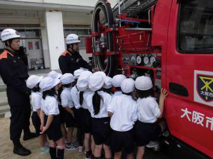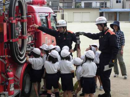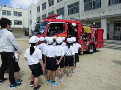 「消防車見学」の様子です。1年生が見せてもらいました。かっこいい消防士さんたちが、消防車の仕組みを教えてくださいました(^O^)