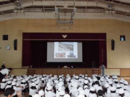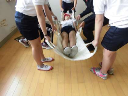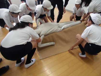「簡易担架救護体験」の様子です。一番難しいので6年生のみの体験です。身の回りの物を利用して、負傷者を安全に運ぶ担架を作成し、運ぶ体験を実施しました。また、講堂では、DVDを見ながら防災の学習をしました。
