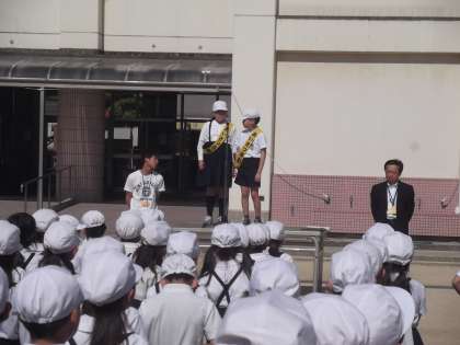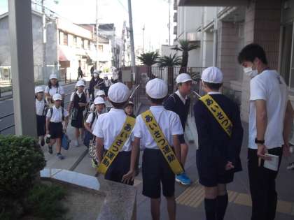正門に代表委員会の子どもたちが立ち、あいさつを呼びかけます。