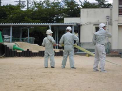 いよいよ最後は、地域防災リーダーによる「可搬式ポンプ操作訓練」の様子を見せていただきます。迅速な動きでホースをつなぎ、プールの水を利用して砂山の上のコーンめがけて放水が正確になされ、子ども達や保護者の方々から拍手が湧き起こりました。