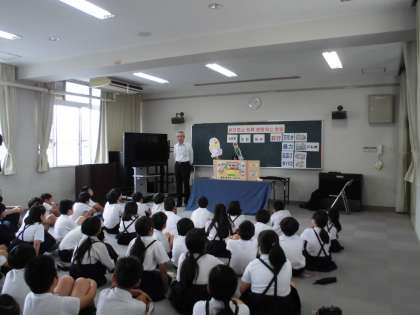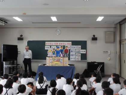 東住吉警察・生活安全課の方に来ていただき、5年児童を対象に「非行防止・犯罪被害防止教室」を実施しました。「万引き」を遊びの延長線のような軽い気持ちでやってしまったり、誘われて断れず、窃盗犯罪に手を染めてしまったり、社会のルールに反する「犯罪者」となってしまうことがあることを、ペープサートを使って分かりやすく教えてくださいました。