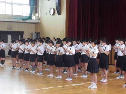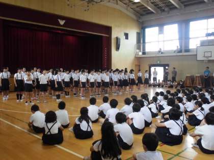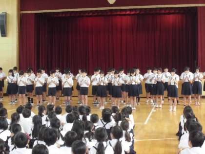 6年生は、「卒業に向けて」を学年目標として、一つひとつのステップを59人で力を 合わせて進んでいく、そのためには1年生から5年生の協力なくしてはできない、だか らパワーを貸してほしい、ということを伝えてくれました。全校児童、しーんとして聞 き入っていました。