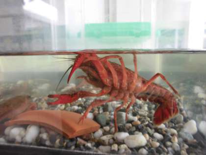 教室で飼っている生き物に、新しい仲間「ザリガニ」がやってきました。元々いた金魚はそばを通るだけで、「エサ!ちょうだい!」と寄ってきます。ザリガニも、生活科の時間に遊んだり触ったり、図工科で絵に描いたりする学習があります。楽しみですね。
