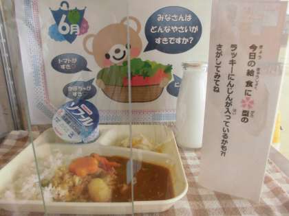 今日のカレーの中には、「ラッキーにんじん」が入っています。調理員さんがにんじんを一つ一つお花型にくりぬいてくださいました。各クラスの食缶の中に数個ずつ入れられています。配膳してもらった人には、何かいいことがあるかも?(^O^)/