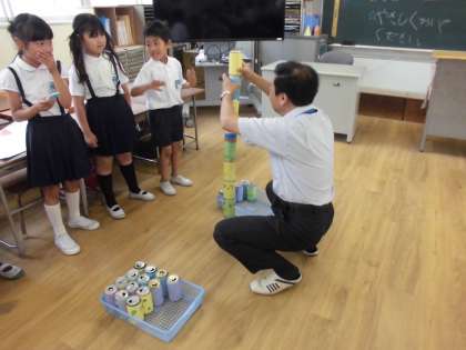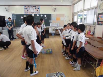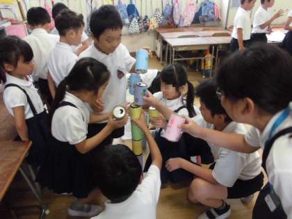 2年1組は、缶を時間内にどれだけ詰めるかというゲームです。ルールの説明を受けた後、チームで協力してカラフルに彩った空き缶を高く積んでいきます。途中で倒れると初めからやり直しです。制限時間があるので、みんなワイワイ楽しんでいました。
