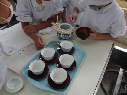 家庭科の調理実習「お茶の入れ方」の学習をしました。「ガスコンロの安全な使い方」と、きゅうすを使った煎茶の入れ方を学びました。お茶の葉の量、お湯の温度、そそぐときは少しずつ茶碗に入れる、などの注意事項を守りながら、実習しました。