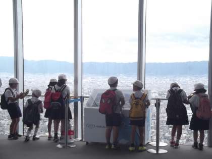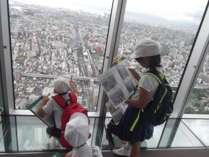 「太陽の塔が見えた!」「ヤンマースタジアムが見えるってことは、鷹合小学校はあの辺にあるってこと!?」「大阪湾に船が見える!」などなど盛り上がりながら…、1時間近くあった見学時間があっという間に過ぎてしまいました。