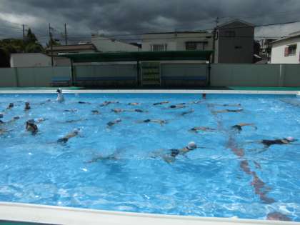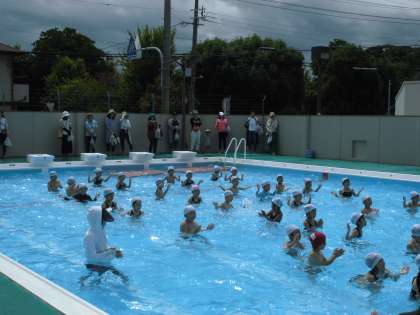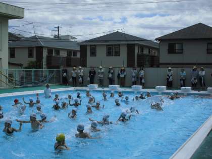 今年度は、PTAの各委員さんに玄関受付のご協力いただけたおかげで、1週間を水泳公開Weekとして実施することができます。今日の午前中は、梅雨明けを思わせる晴天の下、2年・1年・のプール水泳の授業を参観していただきました。