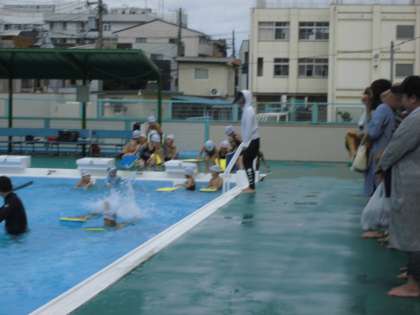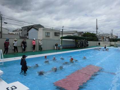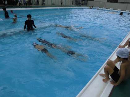 まだ水に顔をつけることが苦手なお子さんも、10秒続けてつけられたら必ず浮きます。家でも、お風呂の時などを利用して洗面器で挑戦したりしてみてください。夏休みに「特別練習」もあります。懇談会の時に担任から話がありましたら、ぜひ参加させてください。