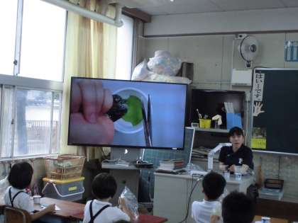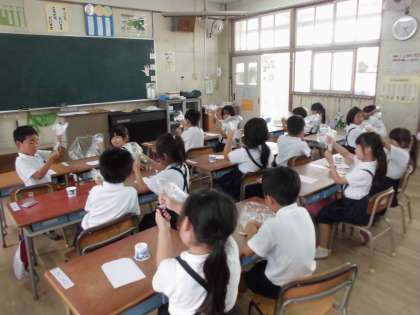 1年生は、本日5時間目の生活に時間に、アサガオの色水づくりをしました。自分たちのアサガオの花を摘み取って、ビニル袋の中に入れます。そして、少量のお水も…。