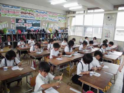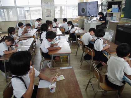 出来上がった色水で、アサガオの絵を描きました。筆でやさしくトントントン…。淡いとてもきれいな色合いの絵になりました。