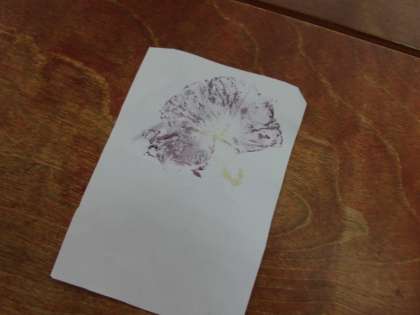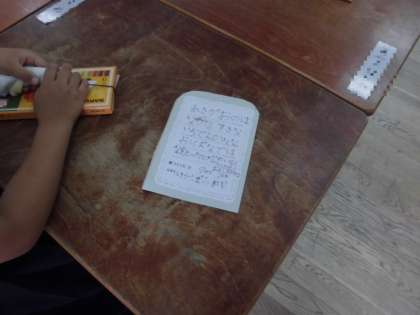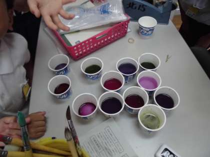 2組は、アサガオのたたき初めをしたハガキ大の紙の後ろに、自分の気持ちを書きました。そして、1組と同じく色水を作って、給食のソフール(ヨーグルト)の空き容器に入れました。「きれいやね」と嬉しそうでした。