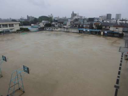 雨が続いていて、運動場が池のようです。