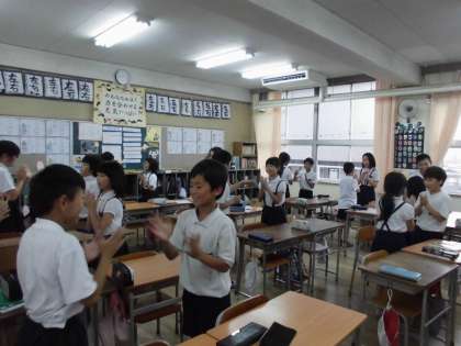 運動場で遊べない分、英語タイムでストレス発散?  4−2では、矢田先生が教えてくれた「アルプス一万尺」の替え歌「アルファベット」を楽しく歌って踊っていました。