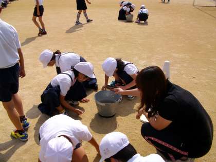 栽培委員会からは、学習園を中心に水やりや雑草取りの活動報告があり(写真左)、美化委員会からは、日頃の美化活動報告と、全校一斉で運動場の石拾いの活動をしました(写真右)。