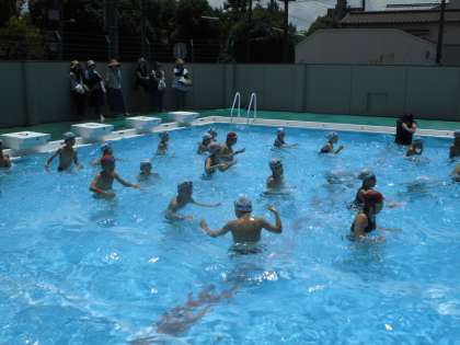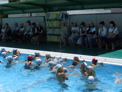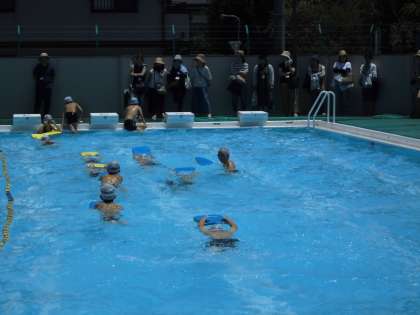 子ども達は、パラダイス(笑)エビカニクスで水慣れしたら、ガンガン泳いでいたようです。泳力別コース指導が始まったら、保護者の方もテント下に避難してもらえました。暑い中、ありがとうございました。