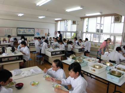 ゆで野菜を食する時は、フレンチソースを作るのが定番なのですが、塩こしょうの他に、しょうゆ・ごま油なども用意されていて、なんだか理科の実験の様になってきています(笑)「先生、味見してみて」と言われて、ちょっと味わうと…(-_-)「これは、みたらしだんごのたれの味ではないの?」「ははは(^O^)」「先生、ごま油ちょっと入れてみるわ」「チャレンジャー!」