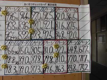 代表委員会が取り組んでいる「あいさつ運動」。先月の取り組み結果を表にまとめて掲示してくれています。自己評価は高いですね。玄関の声は大きく、自分から、すすんでできていると自覚しています。地域の方々や保護者の方々にも同じようにできると花マルなんですけどね(^_^;)
