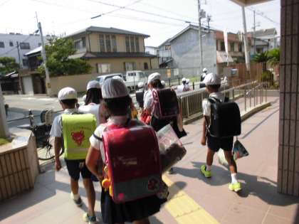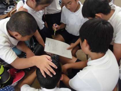 1学期の登校班での反省や、夏休みの過ごし方について、地域別の班で集まって話し合いました。「登校班の集合時刻に遅れてしまった」「ふざけて歩く人がいて困った」などの反省が出ていました。反省を活かして2学期は、がんばってください。