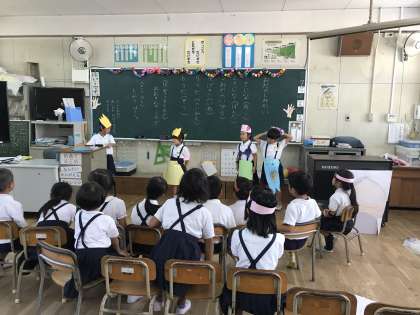 明日は、1学期終業式。その前日は、どのクラスも「お楽しみ会」を実施していました。順番に様子をお伝えします。1年1組は、劇の発表をしているところでした。「お笑い」の劇だったそうなのですが、みんな真剣に見ていました(^O^)
