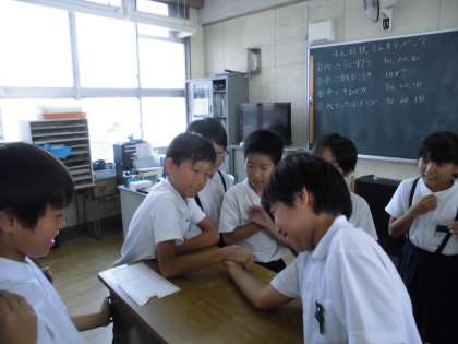 4年1組は、ちょうど班対抗で「うでずもう」をするところでした。恵美先生は、いつも素で笑かしてくれるのですが、今日もやってくれました(笑)うでずもうの掛け声って「「Ready Go!」ですよね?ところが、「位置について。よーい、ドン!」って。もう。走ってまうやろ!とツッコミたかったです。