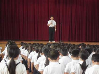 次に、校長先生から「1学期の学習の振り返りをしましょう。」「規則正しい生活を心がけましょう。」「夏休みにしかできないことに挑戦しましょう。」というポイントで、夏休みを迎えるにあたってのお話を聞きました。