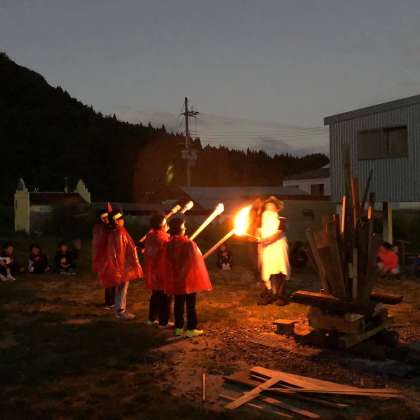 山の端に残光が美しい中、「遠き山に日は落ちて」を全員で歌い、山の神様が厳かに登場されました。