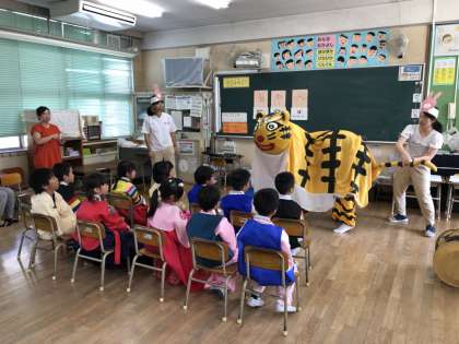 低学年では、韓国・朝鮮の昔話を劇や紙芝居で見せてもらったり、フルーツバスケットを「カゥイ(はさみ)パゥイ(岩)ポー(風呂敷)」の韓国・朝鮮のじゃんけんで遊んだりしたそうです。このトラの被り物の中の人は、津村先生だそうです(^o^)