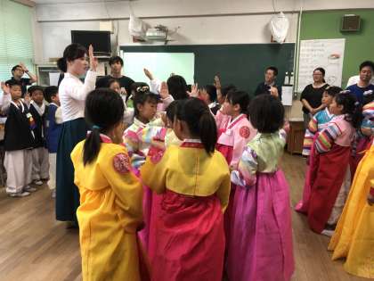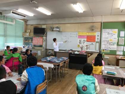 中学年では、イルㇺ(名前)・学校・学年を入れて自己紹介、ウリナラ(自分たちの国)の楽器クイズ、ミニチャンゴづくりなどをしたそうです。