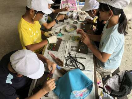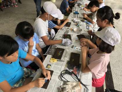 ツルツルにした焼き板に、5色のペイント材を使って、思い思いの「ハチ高原の思い出」を描いていきました。