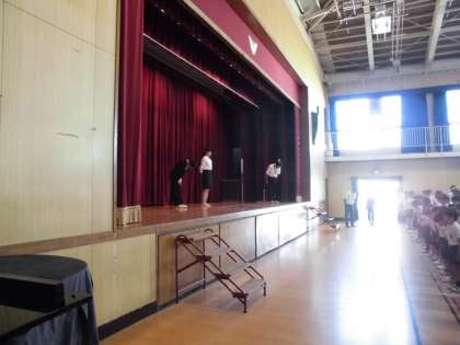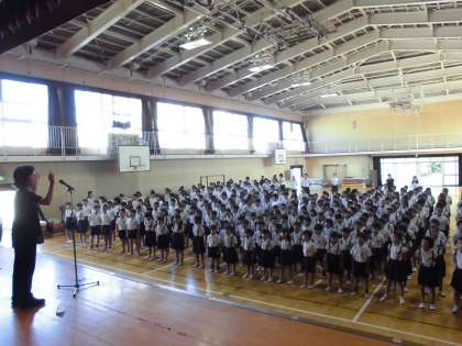 ますは、「校歌斉唱」です。「たかあい〜♪、たかあい〜♪」と元気な声が、講堂いっぱいに響き渡りました。暑さも吹き飛ばす歌声でした。