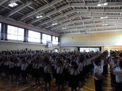 続いて、校長先生からのお話です。1学期の終業式での「夏休みにがんばること三つ」について、自己チェックするように言われました。「1学期の復習をする」「規則正しい生活をする」「夏休みにしかできないことをする」の三点を「○△×」のハンドサインでチェックし合いました。三番目のチェックの時に「これは、できたわ(^○^)」と自信を持って「○」を出していました(笑)