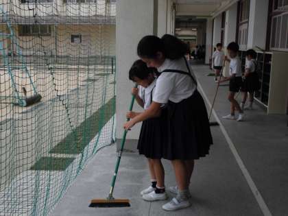 夏休みの間に、廊下や階段、教室の隅々にたまっている砂埃やチリを、たてわりグループに分かれて、2学期の学習がスムーズにスタートできるように、みんなで清掃しました。
