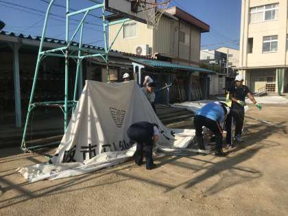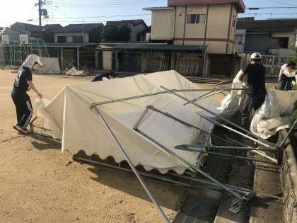 見るも無残な様子になってしまっていたテント。児童が登校してくる前に、安全な運動場に戻しておかねばなりません。教職員で早く来れるメンバーが集結して、早朝から片づけました。また、校内の安全を確認して回りました。