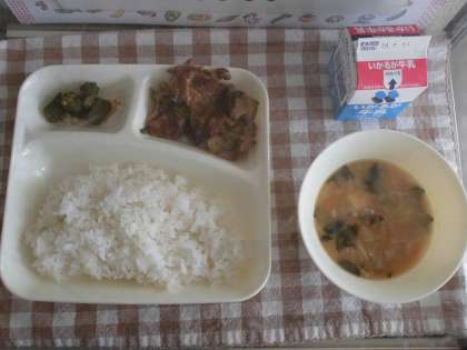 本日の給食献立は、豚肉の甘辛焼き、オクラのおかかいため、ごはん、みそ汁、牛乳です。