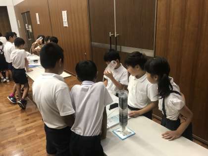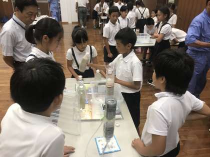 広い浄水場内の見学の後、館内で「じょうすいジョー」のDVDを見せてもらい、その後「浄水ろ過実験」をグループごとに実施しました。泥水が、きれいな透明水になるまでの実験です。一つ一つの過程をグループで協力しあって実施し、どのグループも実験成功でした。