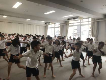本日、4日目にして、エンディングまで流す様子を、多目的室前を通りかかって、観覧しました。細かいところはまだまだこれからですが、群舞の迫力と子ども達の真剣な熱い思いが伝わってきました。おもわず写真に撮りました。