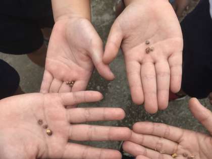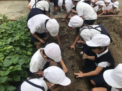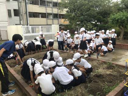 3時間目、学習園で田辺大根の種をまきました。雨上がりなので、ちょうど土が柔らかくなっていて、指で土に穴をあけることが容易かったです。一人ずつ種を受け取り、形や大きさを観察した後に、学習園に入り植え付けました。