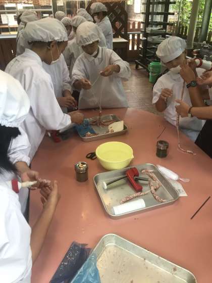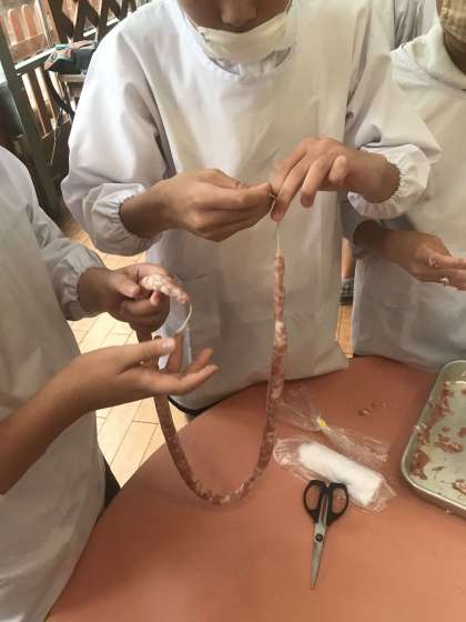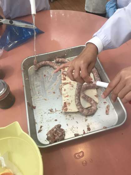 詰めのところは、見本での説明を受けてから、各グループに戻って、協力して行いました。袋詰めのあと、ネジネジと捻って、ソーセージらしくなってきました。