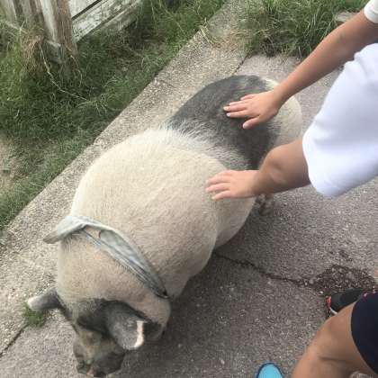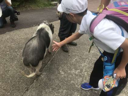 ミニ豚は、さわってみると体毛が、ゴワゴワしてて。みんな恐る恐るさわっていました。