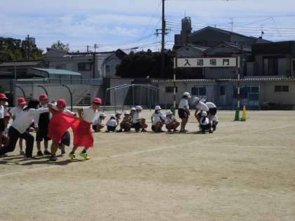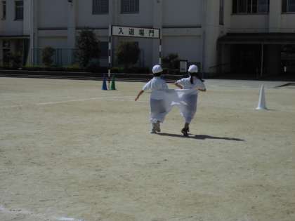 大きなデカパン(河野サイズ?(笑))を二人ではいて、息ピッタリに速度を合わせて、コーンを周ります。バトン代わりのデカパンの着脱が、なかなか大変です。デカパンで走る姿が可愛いです(^O^)