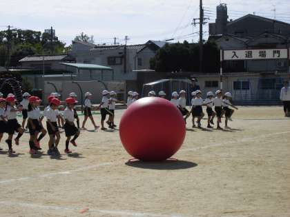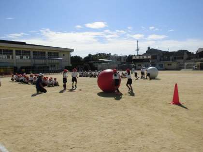 自分の身長ほどの大玉を、二人で転がしていきます。簡単なようで難しいです。二人の調子を揃えないと、あらぬ方向へ大玉はころりん、ころりん…と転がっていってしまいます。がんばれ〜♫(^O^)
